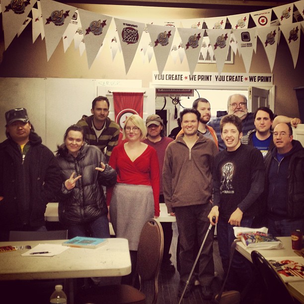 (photo by Darwin Santos) Many people finished their pages but left earlier. This was the crew that decided they were hanging in for the full 24 hours no matter what! Even after having finished his 24 pages AND a cover for SAD ROBOT, Chris Yao had been valiantly sketching just before time was called.